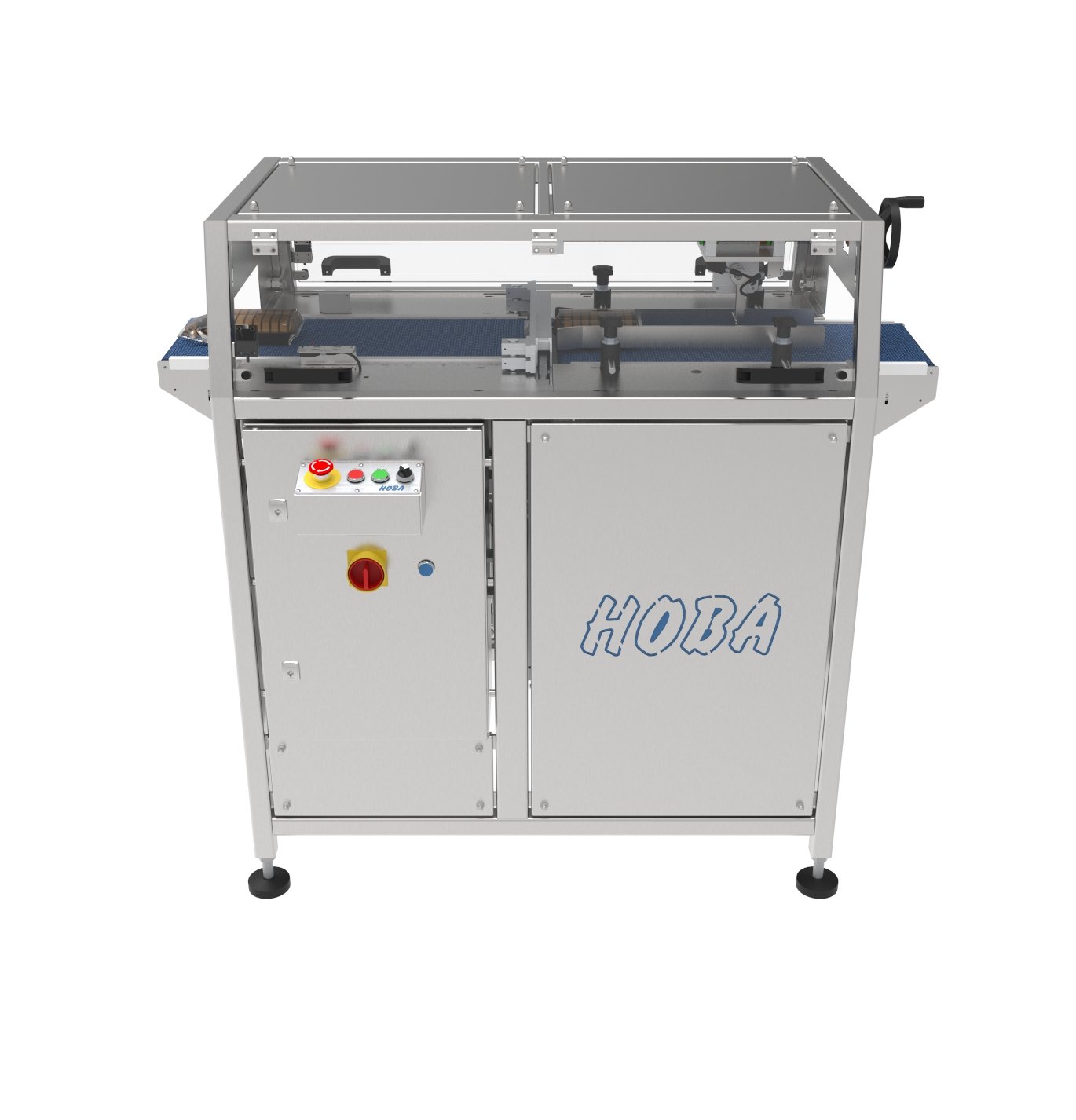 - Transportation of the products with 2 conveyor belts.