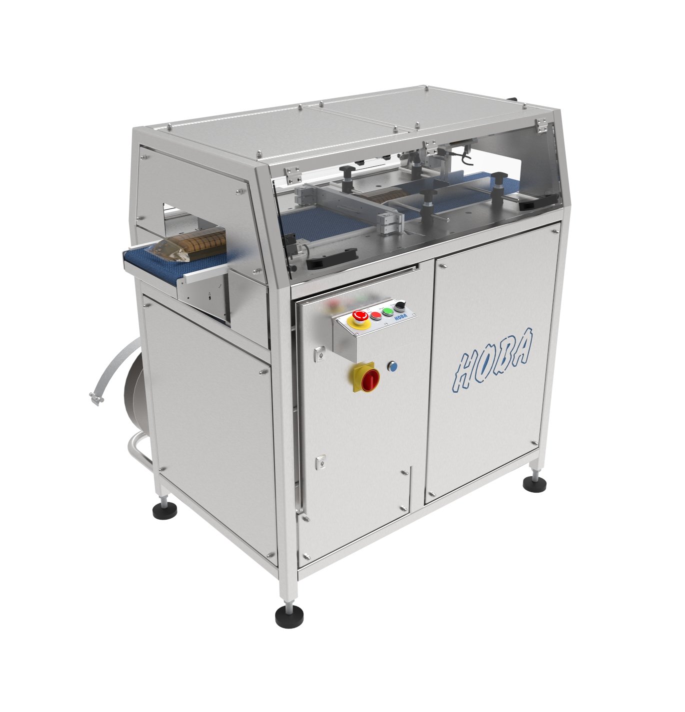 - Pneumatic pusher to keep products in the right place.