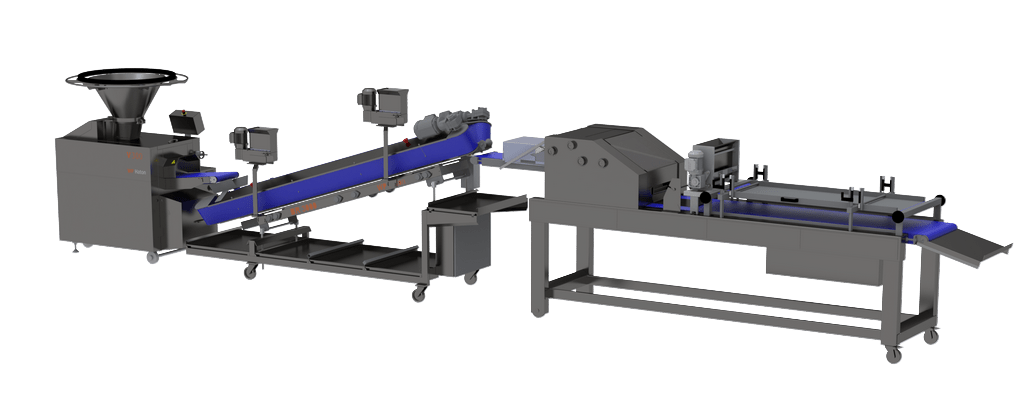 Dough without an intermediate proofing time are carefully transported on the belt rounding machine before further processing. Highly dough friendly and weight accurate, the Ryena concept is a very solid concept that complies with all the requirements of an industrially automated production unit. The belt rounded gently guides the individual dough pieces from the divider to the moulder, so even dough with a low gluten content can stay in a constant shape and size.