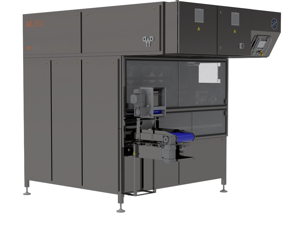 The AF 2002 is a non-tumbling intermediate proofer for round or for pre-moulded oblong dough pieces in pockets or trays. Dough pieces are rested or proofed without tumbling during the proofing process. The AF 2002 proofer is especially suitable for soft and pre-fermented dough types with a long floor time. The ultraviolet lamps prevent mold forming on the inside of the proofer, and the transparent polycarbonate windows allow for visual inspection of the dough pieces.